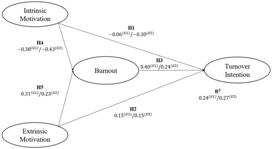 By applying multigroup analysis, researchers are able to test for differences between two identical models for different groups [95]. In Table 7, when contrasting the insidence of gender in the model as a whole, the subsamples (male and female) did not show significant differences. This result implies that IM and EM produce the same effect of turnover intention through BO for both the male and female group; therefore, there are no gender differences in this situation.