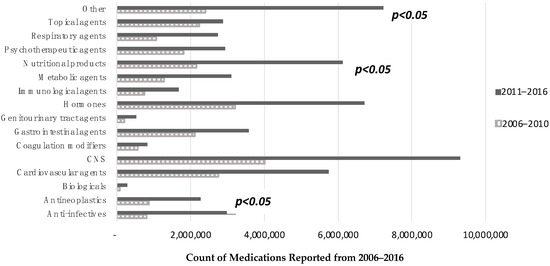 From 2006 to 2016, the most frequently prescribed medications by drug category were centrally nervous system (CNS) drugs (n = 13.33 million; 15%), hormones (n = 9.92 million; 11%), cardiovascular agents (n = 8.50 million; 10%), and drugs categorized as other (n = 9.64 million; 11%). Significant differences were found in the reported numbers of anti-infectives, nutritional products, and drugs classified as other over the years. There was an increase in those medications from 2006–2010 to 2011–2016 (Figure 1). Biologicals were prescribed minimally (n = 362,170; 0.04%). The top medications prescribed in visits for lupus patients from 2006 to 2010 were prednisone (n = 2.00 million; 19%), hydroxychloroquine (n = 1.91 million; 18%), multivitamins (n = 864,744; 8%), esomeprazole (n = 692,747; 7%), and methotrexate (n = 691,950; 7%) (Table S3). From 2011 to 2016, the top medications prescribed were hydroxychloroquine (n = 6.22 million; 37%), prednisone (n = 4.15 million; 25%), multivitamins (n = 2.89 million; 17%), furosemide (n = 2.21 million; 13%), and folic acid (n = 1.47 million; 9%). Further, a significantly higher number of prescriptions for hydroxychloroquine than for other drugs was identified (p < 0.05).