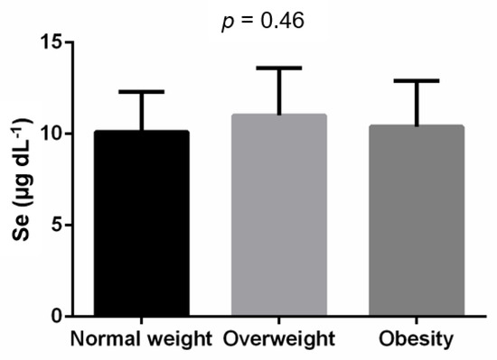 We did not find significant association between BMI and serum Se level in the correlation analysis (r = 0.09; p = 0.37; Table 2). No differences were observed when comparing the serum Se levels between individuals with normal weight, overweight and obesity (p = 0.464, Figure 1).