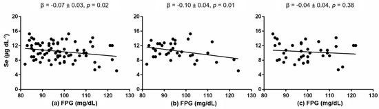 First, we performed a correlation analysis between the cardiometabolic traits and serum Se level (Table 2). Only FPG was significantly correlated with serum Se level (r = −0.24, p = 0.02). FPG continued significantly associated with serum Se level in a linear regression model adjusted for age, sex and BMI (β = −0.07 ± 0.03, p = 0.02; Figure 2).