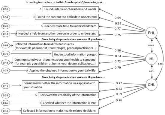 The highest subscale correlation was observed between the IHL and CHL subscales (r = 0.851). Independent of the modeling approach, the lowest factor loadings were observed for the items FHL1 and IHL2.