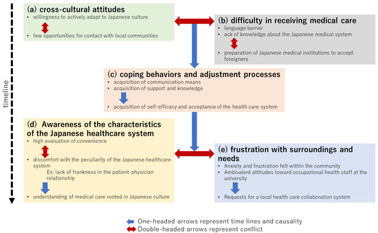 Figure 1 organizes the relationship between the themes and subthemes over time, showing not only the specific adaptation process of the participants, but also the process of their internal efforts to overcome the gap between their ideals and reality in accepting the foreign culture. While (a) represents their ideal attitude toward a foreign culture they do not yet fully know, (b) represents their subsequent condemnation and bewilderment when they are confronted with it. This contradictory sense of (a) and (b) is integrated in the process of adaptation in (c), and in (d), they come to terms with Japanese medicine, fairly assess its strengths and weaknesses, and try to understand the doctor’s aloofness in the higher context and Japanese implicit communication style. Nevertheless, the demand for privacy rights and self-determination remained, as seen in the content of theme (e) concerning loneliness and workplace health checkups. Moreover, some believed that a reliable primary care physician could solve those problems. An additional stage of adaptation beyond this may be necessary, although the participants of the present study did not indicate such.