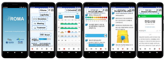 The overall structure of the mobile application is shown in Figure 6. Membership registration is possible only when the information registered in the manager program is matched. If it is linked with OCS, the user can sign up through personal information registered with the hospital. On the first screen after logging in, the patient’s current schedule, treatment progress, and expected end date of treatment are displayed on the home screen. The treatment schedule calendar, side effect questionnaire input, side effect management method, and disease information are organized in the lower tables. The side effect questionnaire, disease management method, and disease information entered by the doctor are displayed, and the patient can view the information by scrolling up and down using the swipe function. Therefore, patients can browse their treatment schedule, manage their disease, and freely report side effects to doctors through the side effect questionnaires.