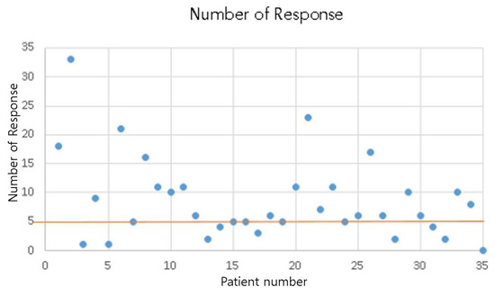 One patient consented to the study but did not actually use the application. The average side effect response number was 8.8 times during the treatment period. The mean adverse event response time was 4.4 days. A total of 32 people answered more than two times (91.4%) (Figure 7).