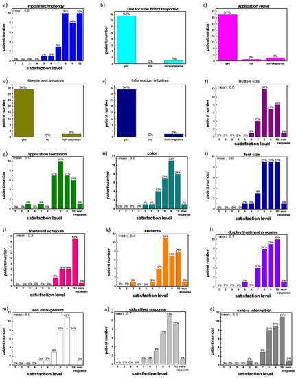 Figure 8. The items evaluated by questionnaire: (a) positive perception of mobile technology, (b) the possibility to report side effects, (c) the possibility of application re-use, (d) simple and intuitive application, (e) information intuitive, (f) button size, (g) formation of application, (h) color of application, (i) font size, (j) satisfaction with treatment schedule function, (k) satisfaction with contents, (l) satisfaction with treatment progression display, (m) satisfaction with self-management, (n) satisfaction with side effect reporting, (o) satisfaction with cancer information.