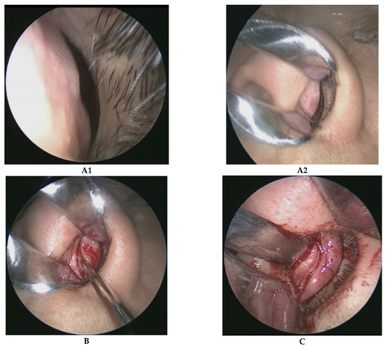 Autologous septal cartilaginous batten grafts were reshaped and reconstructed in the concave side of the caudal nasal septum. As seen in Figure 1D1, the batten graft was reconstructed in the right (concave) side of the nose, and Figure 1D2 shows the batten graft as supported in the left (concave) side of the nose. The L strut cartilage was preserved for at least 1.0 cm from the caudal end and the connection between the septal cartilage, and the anterior nasal spine was also maintained. There were no incisions or wedge resections of the caudal nasal septum. The L-shaped caudal end and the cartilage batten graft were connected via through-and-through sutures with three stitches using 5-0 Prolene sutures in the concave side (Figure 1D2). Finally, the mucoperichondrial flaps were repositioned and 5-0 Vicryl simple sutures were used to close the incision wound (Figure 1E). Bilateral inferior turbinoplasty was also performed in all 26 studied cases. Absorbable nasal packing (nasopore) was packed bilaterally. Figure 2A1 shows the caudal septal deviation to the left side, and Figure 2B1 shows the right side. We reshaped and reconstructed the cartilaginous batten graft for the concave side (Figure 2A2,B2). We applied three stitches using through-and-through sutures to fix the batten graft and 5-0 Prolene sutures for the caudal end of the L strut. The nodes were fixed in the concave side (Figure 2A3,B3). When we performed surgery on the middle and posterior segments of the nasal septum, we used an endoscope. We also used an endoscope when we did inferior turbinoplasty.