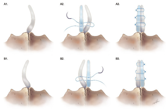 - Jang, Y.J.; Yeo, N.-K.; Wang, J.H. Cutting and Suture Technique of the Caudal Septal Cartilage for the Management of Caudal Septal Deviation. Arch. Otolaryngol. Head Neck Surg. 2009, 135, 1256–1260. [Google Scholar] [CrossRef] [PubMed]