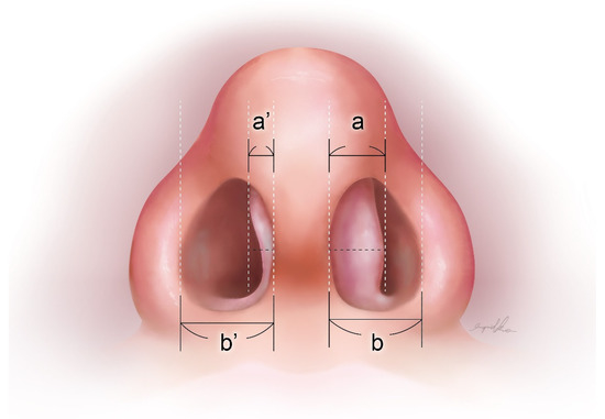 To evaluate outcomes preoperative, 1-month postoperative, and 6-month postoperative, we used the NOSE scale based on chart records and VAS using flexible nasopharyngoscopic graphs. The definition of VAS of the convex side measured distance from the largest protruding part of the caudal nasal septal region (convex-most part) to the midline (Figure 3a) divided by the distance of the unilateral nasal floor (Figure 3b). The VAS of the concave side was also measured as the largest protruding part to the midline (Figure 3a’), which was divided by the distance of the unilateral nasal floor (Figure 3b’). All data were multiplied 10-fold for calculation and analysis (Convex a/b × 10; Concave a’/b’ × 10).