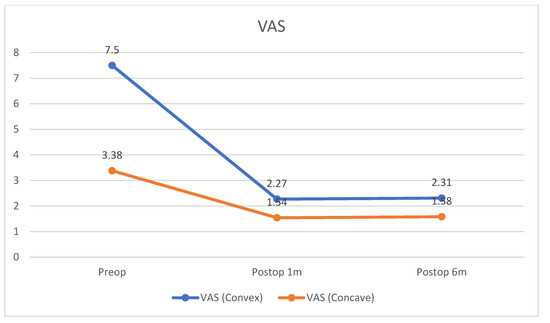 Preoperative status showed significant improvements in both NOSE scale and VAS after endonasal functional rhinoplasty using an autologous septal cartilaginous batten graft (Table 1 and Figure 4) for both postoperative time points. However, when comparing postoperative 1 month and 6 months, there was no significant difference in neither NOSE scale (t-test; p = 0.862) or VAS (p = 0.327 for the convex side; p = 0.664 for the concave side). During our follow-up period, no patients experienced severe complications, such as saddle nose deformity, nasal tip collapse, or septal hematoma, and there were no other complications such as narrowing concave side due to batten graft, septal abscess, infection, septal perforation, severe bleeding, graft extrusion, nasal cavity granulation tissue formation, hyposmia, or nasal tip numbness [3,16].
