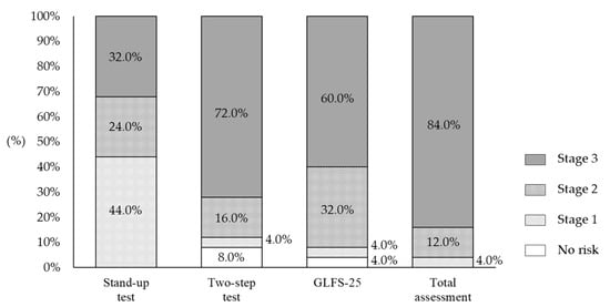 Figure 1 shows the distribution of LS risk levels based on the results of the stand-up, two-step, and GLFS-25 risk assessment tests and the total assessment for all participants. In the total assessment, all of them were determined to be LS (stages 1, 2, and 3).
