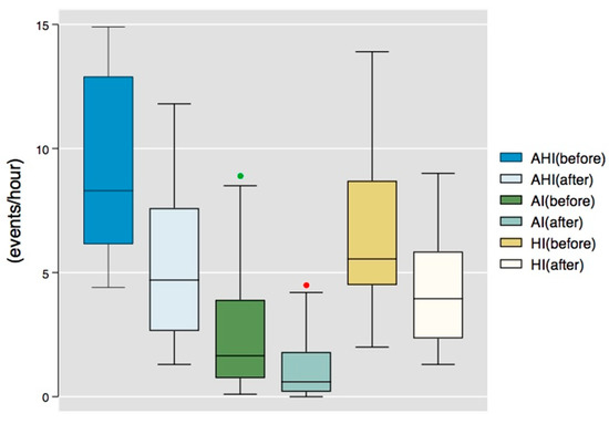 Box graph of apnea/hypopnea index (AHI), apnea index (AI), and hypopnea index (HI) before and after mouth-taping. (The green and red dots represent outliners of each parameter).