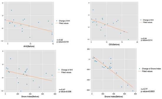 Correlation tests between variables (including the change of AHI from baseline AHI, ODI, and snoring index, and the change in snoring index from baseline snoring index).