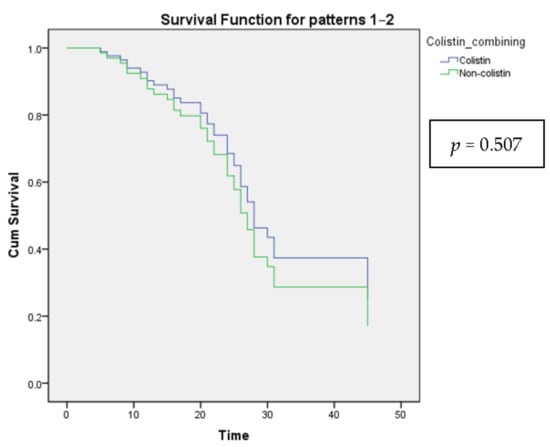 The Cox proportional-hazards model shows the survival curves for all categories of the categorical variable Colistin combining.