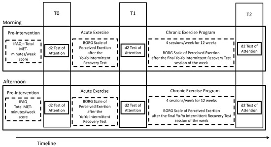 We chose this test because it assesses attention and concentration and physical activity has been associated with beneficial effects on attention/concentration capacity [54,55]. The d2 Test of Attention was assessed before the physical activity session (Yo-yo Intermittent recovery test) and immediately after the acute intervention and 12 weeks later, after the final session of the intervention protocol.