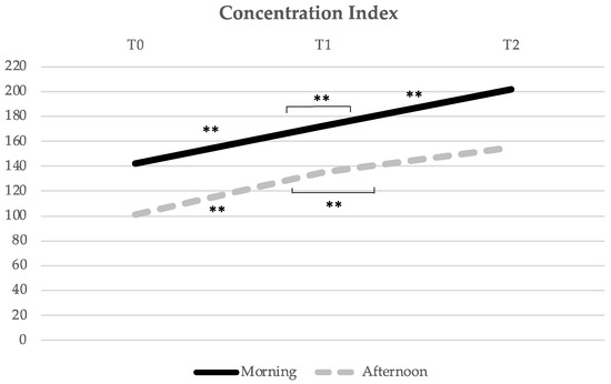 Evolution of the Concentration Index mean score over time (from T0 to T1, i.e., from pre- to post-acute exercise; and from T1 to T2, i.e., from post-acute exercise to post-chronic exercise). ** Indicates significant differences for p < 0.01.