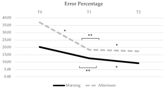 Evolution of the Error Percentage mean score over time (from T0 to T1, i.e., from pre- to post-acute exercise; and from T1 to T2, i.e., from post-acute exercise to post-chronic exercise). * Indicates significant differences for p < 0.05; ** Indicates significant differences for p < 0.01.