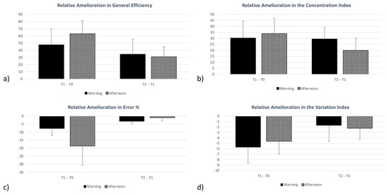 Relative Amelioration Scores in (a) General Efficiency; (b) Concentration Index; (c) Error Percentage; and (d) Variation Index. Error bars represent Standard Errors. No significant differences were found.