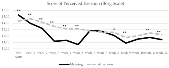Finally, this study is not without limitations. The study design did not include a control group, which would strengthen our results and conclusions. Although the morning and afternoon groups were homogeneous in terms of activity level and started at the same baseline in terms of performance in the cognitive task (d2 attention test) and fitness level (IPAQ) our results do not completely clarify whether groups with no activity level might show significant differences in cognitive performance over time. Thus, it is unclear if the cognitive benefits observed are due to the passage of time or due to physical exercise. Furthermore, self-reported data were also used to assess activity level (IPAQ) and perceived exertion (Borg scale), which may suffer from eventual biases (e.g., from memory, critical judgment, social desirability).
