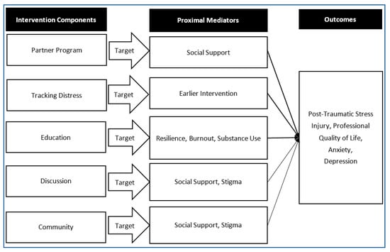 The Knowledge to Action Framework [100] and Consolidated Framework for Implementation Research [101] were selected to guide program development and plans for implementation. Narrative review and stakeholder meetings were conducted to broaden our understanding of the mental health challenges associated with HCW and PSP work, evidence-backed approaches to tackling these issues, and successes and failures of past programming (including a thorough review of programs available, what they include, whether they have been systematically implemented and evaluated and all pertinent reported outcomes). STEADY was named based on the five main components that create the pillars for the program’s framework: social support (through peer partnering), tracking distress for proactive intervention (rather than distress-initiated intervention), education regarding the problem to normalize distress and introducing strategies to build personal resilience, discussion (through peer support groups and voluntary debriefing following critical incidents), and community-building initiatives. These interventions/approaches were identified during the narrative review and selected based on their potential to impact proximal mediators of the outcomes of interest. In this case, we chose to focus on mitigating negative outcomes of PTSI, anxiety, and depression and improving the positive outcome of professional quality of life (which includes components of compassion fatigue and burnout mitigation). Figure 2 outlines the hypothesized mediation of effect for each intervention/approach included in STEADY.