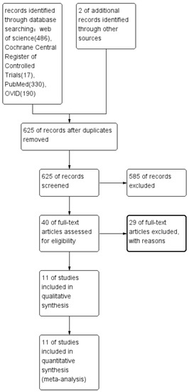 In total, 1063 articles were initially included, comprising 1023 from electronic searches and 2 from other resources; 625 records were retained after duplicates were removed. We screened the 625 articles and finally found 40 articles [4,5,6,8,9,11,15,16,20,21,22,23,24,25,26,27,28,29,30,31,32,33,34,35,36,37,38,39,40,41,42,43,44,45,46,47,48,49,50,51,52] for further assessment. We assessed 40 articles [4,5,6,8,9,11,15,16,20,21,22,23,24,25,26,27,28,29,30,31,32,33,34,35,36,37,38,39,40,41,42,43,44,45,46,47,48,49,50,51,52] by full-text reading, and finally found 11 suitable articles [4,8,9,11,15,16,40,42,46,47,48]. A flow chart of the selection process is shown in Figure 1. The k statistic index, which was more significant than 0.9, showed good agreement between the two reviewers. We included two randomized controlled trials (RCT) [8,42], one case–control study [40], and eight cohort studies [4,9,11,15,16,46,47,48].