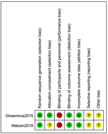 Risk of bias graph: review of authors’ judgments about each risk of bias item for 2 RCT studies. (+) = low risk of bias; (?) = unclear risk of bias; (−) = high risk of bias.