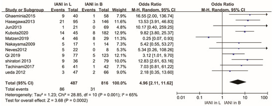 Forest plot of sensitivity analysis for the rate of inferior alveolar nerve injury in buccal and lingual position of the IAC relative to the LM3 roots after the extraction of the mandibular molars. Abbreviations: IANI, inferior alveolar nerve injury; L, lingual position; B, buccal position; CI, confidence interval; M-H, Mantel–Haenszel.