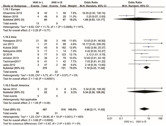 Forest plot of subgroup analysis for the rate of inferior alveolar nerve injury in buccal and lingual position of the IAC relative to the LM3 roots after the extraction of the mandibular molars according to different relative continents. Abbreviations: IANI, inferior alveolar nerve injury; L, lingual position; B, buccal position; CI, confidence interval; M-H, Mantel–Haenszel.