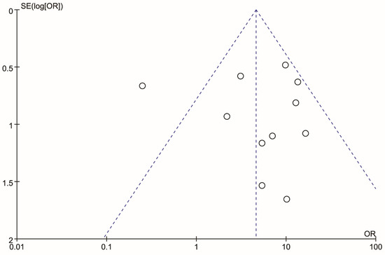 A subgroup analysis was conducted according to the classification of different relative continents in consideration of the existence of racial differences [53]. One study [46] came from South America, two studies [8,42] came from Europe, and eight studies [4,9,11,15,16,40,47,48] came from Asia. There was a statistical difference in the Asian group (OR, 7.10; 95% CI, 4.23 to 11.92; p < 0.00001). No statistical difference was found in the European group (OR, 1.88; 95% CI, 0.03 to 131.77; p = 0.77). The heterogeneity of the Asian group was low (p = 0.57, I2 = 0%), and the heterogeneity of the European group was high (p = 0.0006, I2 = 91%). These results indicated that studies from the European group might be associated with the high heterogeneity of the whole research. Detailed information is shown in Figure 4.