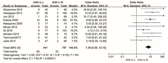A funnel plot was created to visualize the origin of the high heterogeneity, as shown in Figure 5. The funnel plot showed that an article [42] may be the origin. A sensitivity analysis was carried out to judge whether the article [42] caused heterogeneity. After we removed the article [42] from the sensitivity analysis, we found that the heterogeneity changed largely. A statistical difference was found in the rate of IAN injury between cases where the IAC was positioned buccally and lingually with respect to the LM3 roots (OR,7.38; 95% CI, 4.50 to 12.12; p < 0.00001), with low heterogeneity (p = 0.70, I2 = 0%). Details are shown in Figure 6.
