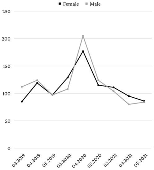 The data in Table 1 show the distribution of patients according to the different age groups. In 2019, in March, patients aged between 20 and 29 years predominated (24.9%, n = 49) and in the months of April and May, the largest number of patients was aged between 0 and 9 years (24.7%, n = 60—April; 25.8%, n = 50—May). In 2020, patients from the 20–29 age group predominated in March (19%, n = 45) and May (18%, n = 43), while in April, patients from the 30–39 age group predominated (19.4%, n = 74). In 2021, the largest number of patients who came for emergency treatment was from the 20–29 age group, in March (22.8%, n = 49), April (28%, n = 49), and May (23.5%, n = 40).