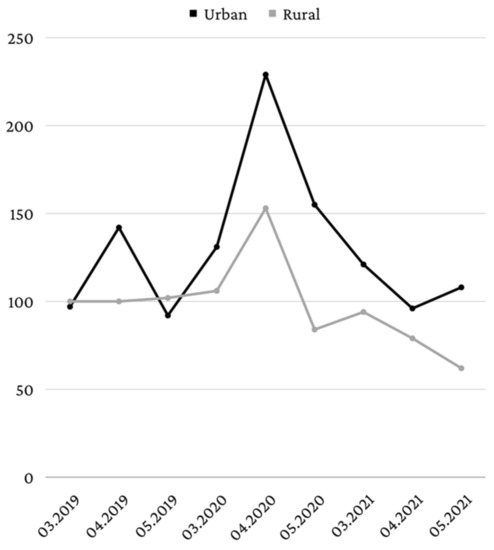 In terms of patient distribution by living environment, in March 2019 and May 2019, a slight predominance of patients from rural areas was identified (50.8%, n = 100—March; 52.6%, n = 102—May), but in April 2019, patients from the urban environment predominated (58.4%, n = 142). In the period from March to May 2020, patients from the urban environment predominated, in all 3 investigated months. Thus, in March 2020, 55.3% (n = 131) of the patients came from the urban environment, in April 2020, 59.9% (n = 229), and in May 2020, 64.9% (n = 155). In 2021, patients from the urban environment predominated in all 3 months, as follows: 56.3% (n = 121) in March, 54.9% (n = 96) in April, and 63.5% (n = 108) in May, a situation similar to that in 2020 (Figure 3).