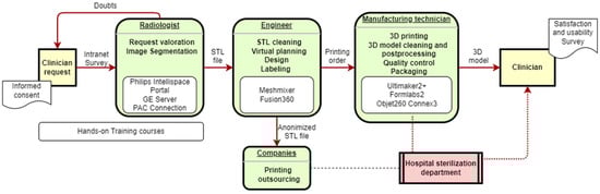 The workflow defined for our hospital is described in Figure 2. There are different steps and personnel involved in the medical 3D printing process and the manufacturing of anatomical model processes or customized devices for each patient.