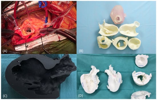 Anatomical model for planning, training, teaching and patient communication of obstructive hypertrophic cardiomyopathy (cardiovascular Surgery). (A) Surgical field and intraoperative vision in HCM surgical treatment. (B) Three-dimensional anatomical models for HCM planning, with pieces that represent the short axis and 3 chambers, manufactured by MJ technology. (C) A 3D anatomical model for HCM planning, showing a piece that represents longitudinal cutting of one chamber, manufactured by SLA technology. (D) Height and depth references of the resection to be performed on the cardiac wall, painted on the printed anatomical biomodel. References are painted on the diathermy loop itself.