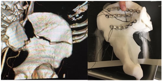 The treatment of pelvic fractures involves a complicated approach for the osseous pelvis, which contains viscera and large vessels that make handling difficult. These fractures require complex bone reconstruction using osteosynthesis plates, which must be perfectly adjusted to the patient’s anatomy. Current surgical methods entail a great loss of time during the operation, sometimes with a difficult and/or dangerous approach, which limits the final retouching of the plates. This final adjustment of the plates is performed at the surgeon’s discretion and requires great expertise [41]. The trial-and-error method necessary to obtain an appropriate molding presents the disadvantage of excessive operating time, which is not convenient for the patient. The combination of reverse engineering with AM can provide a solution to this problem. Thus, the plates can be molded before the operation based on a previously printed biomodel obtained directly from a scan of the patient, reducing the operating time and costs and providing benefits for the patient, such as less exposure and lower infection risk [41,42] (Figure 5).