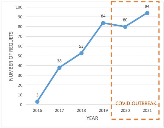 Evolution of requests registered on the intranet for 3D printing models at Cruces Hospital. It shows the requests received since the start-up of the service (September 2016) until the end of the present study (December 2021).