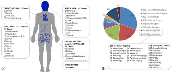 (A) Number of requests ranked by anatomy, grouped into 4 types of systems: head and neck, cardiovascular, musculoskeletal and soft tissues. Another group with other types of requests is also indicated. (B) Percentage and number of requests received by each hospital department. A total of 27 departments made at least one request. The departments with the fewest requests were grouped together: a group with 3 to 6 requests and a group with 1 or 2 requests. This figure was designed using resources from www.flaticon.com, accessed on 17 July 2022.