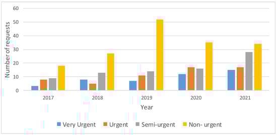 (i) Response time. One of the main aspects that justifies in-house manufacturing is the urgency response time. To analyze the urgency of the requests received, four levels of urgency were differentiated: Very Urgent (delivery within 3 days), Urgent (delivery within 3–7 days), Semi-urgent (delivery within 7–14 days) and Non-urgent (delivery after 14 days or delivery date not specified) (Figure 8).