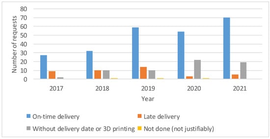 The majority of cases (69.03%) were delivered on time, whereas in 17.9% of cases, the request was not urgent or did not require 3D printing (Figure 8). In addition, 1.14% of the requests were not performed due to technical problems, and the remaining 11.93% did not arrive on time. As shown in (Figure 9), since 2020, there has been a lower number of cases not completed or not delivered on time.