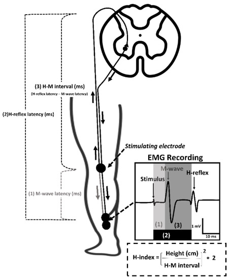 The H-reflex latency and M-wave latency were measured by the time (ms) from the stimulus artifact to the onset of the H-max and to the onset of M-max, respectively. The difference (ms) between the H-reflex latency and the M-wave latency (H-M interval) was further normalized to the participant’s height to calculate the H-index [14], shown in Figure 1, with a lower H-index indicating a slower CV-SRP.