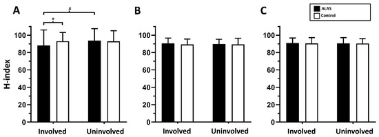 Comparison of H-index of the involved and uninvolved limb between two groups. Group data for soleus (A), fibularis longus (B), and tibialis anterior (C). * Soleus H-index of the involved limb in the acute ankle sprain group is significantly slower than that in the control group, p < 0.05. # Soleus H-index of the involved limb is significantly slower than that of the uninvolved limb in the acute ankle sprain group, p < 0.05.