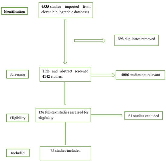 Grey literature and review articles that were not peer-reviewed were excluded. No language or publication restrictions were applied. We identified 136 articles for full-text review. The full-text review generated 75 articles. Upon reviewing the 136 full-text articles, sixty-one (61) articles were excluded as they did not meet the inclusion criteria. The PRISMA flow diagram summarizes this information in detail (Figure 1).