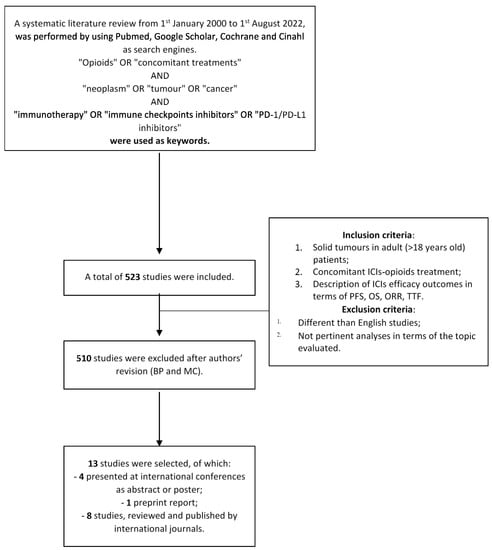 A systematic literature review was performed by using the following search engines: PubMed, Google Scholar, Cochrane, and Cinahl. The following keywords were used: “opioids” OR “concomitant treatments” AND “neoplasm” OR “tumour” OR “cancer” AND “immunotherapy” OR “immune checkpoints inhibitors” OR “PD-1/PD-L1 inhibitors”. We considered reports published from 1st January 2000 to 1st August 2022. It was decided to include only studies, which analysed adult patients affected by solid tumours. Other inclusion criteria were as follows: (1) the description of ICIs efficacy outcomes in terms of progression-free survival (PFS), overall survival (OS), overall response rate (ORR), time to treatment failure (TTF); (2) concomitant ICIs-opioids treatment. Otherwise, (1) language different than English and (2) not pertinent works were excluded. Two authors (MC and PB) reviewed all the studies and approved the selection following the inclusion and exclusion criteria. In case of disagreement a third author (LB) was asked to make the final decision. The following outcomes considered were: PFS, OS, ORR and TTF. Finally, the reviewing process followed PRISMA guidelines [18] even if the authors did not provide its registration to PRIMA website.