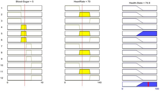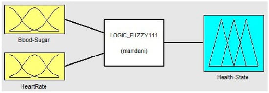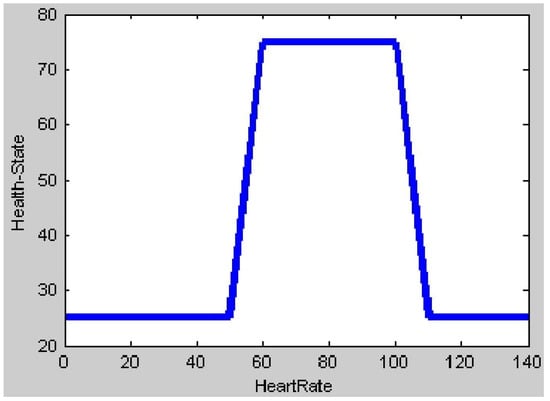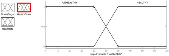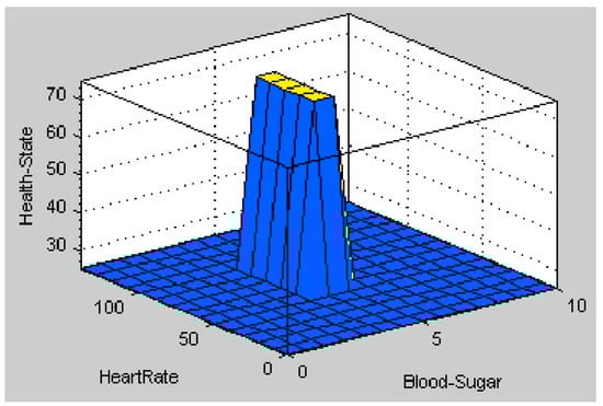 The fuzzy rules are used to infer the output of the fuzzification inputs []. Based on the specified membership functions of the two inputs–blood sugar and heart rate–a set of fuzzy rules for the combination of the two input sensors finalizes the fuzzification rule set out in Table 2. The combination of the given ranges of the two input sensors produces a total of twelve rules. The output of these rules is the health status of a person who may be either healthy or unhealthy. In order to understand this better, the rules are further expressed as follows: