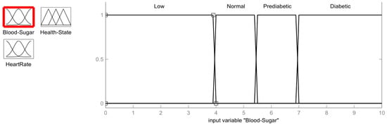One of the inputs used for the fuzzification process is the blood sugar values obtained from the blood sugar sensor, the membership function of which is shown in Figure 3. As discussed before, the membership function values for the blood sugar sensor indicate four conditions: Low (0 mmol/L to 3.9 mmol/L), Normal (4.0 mmol/L to 5.4 mmol/L), Prediabetic (5.5 mmol/L to 6.9 mmol/L) and Diabetic (>7.0 mmol/L). The values of the blood sugar membership are as follows: