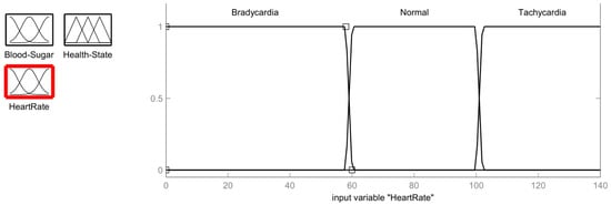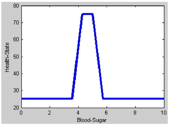 Wearable sensors are used to record the vitals of the patient. Every eight hours, the patient’s blood sugar and heart rate sensors are read. The values obtained from the blood sugar sensor and the heart rate sensors are fed as inputs to the fuzzification process as shown in Figure 2. For each input sensor in the process of fuzzification, a membership function must be developed []. Since we use two input sensors, for the purpose of generating the membership function, the membership function of the blood sugar input is divided into four ranges: low, average, pre-diabetic (moderate), and diabetic (elevated). Similarly, for the heart rate membership function, three input ranges are considered: Bradycardia (low heartbeat), Normal, and Tachycardia (high heartbeat). This information is given in Table 1 for the different blood sugar and heart rate sensor input ranges.