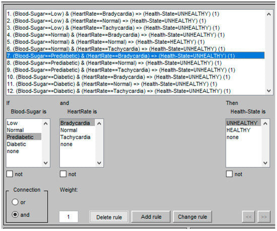 RULE 7: IF Blood sugar == Prediabetic AND Heart rate == Bradycardia then output health state = Unhealthy