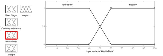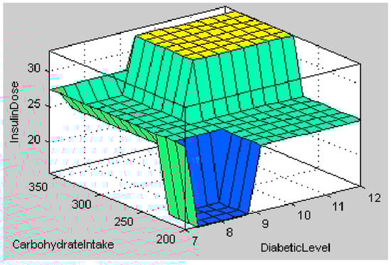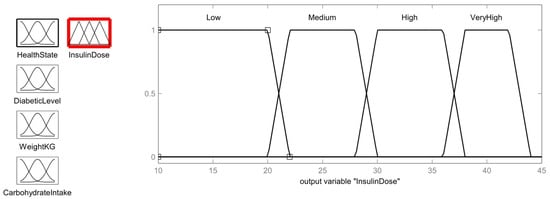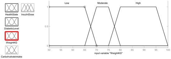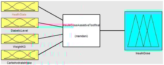 The first stage of a fuzzy expert system is to diagnose whether a person is healthy or unhealthy. This output is considered to be one of the inputs to the second stage of the fuzzy expert system used to determine the dose of insulin for the diabetic patient []. Four input functions, including health status output from the previous fuzzy step, diabetic stage, patient weight, and carbohydrate intake, are considered in this Insulin Dose Assistive Fuzzy Process as shown in Figure 7.