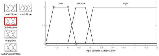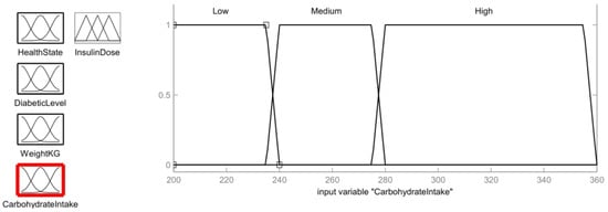 Carbohydrates are the foundation of a healthy diet. However, carbs have an effect on a person’s blood sugar level, so it is crucial to control carbohydrate consumption. The carbohydrate intake level of the patient should also be treated as an input parameter in order to provide an assist tool for calculating the dose of insulin. The carbohydrate membership function is shown in Figure 11. The range of carbohydrates is divided as: low (<235 g), medium (240–275 g) and large (280–355 g).