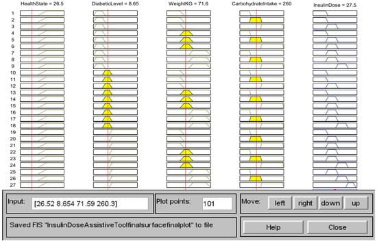 To compare the outcomes with the simulated output value for the insulin dosage, calculations using real-time values have been carried out. For input blood sugar level 8.65 mmol/L, weight 71.6 kg, daily carbohydrate intake 260 g, the total daily insulin requirement is 39.38, the CHO insulin dose is 20.48 and correction dose is 7.25. Thus, the final insulin dosage is calculated as follows: CHO insulin dose + Correction dose = 27.73 units. The simulated output utilizing fuzzy logic is calculated as 27.5 units as from Figure 17. In order to determine that the simulated fuzzy output can be approximated to the calculated value, the results are compared.