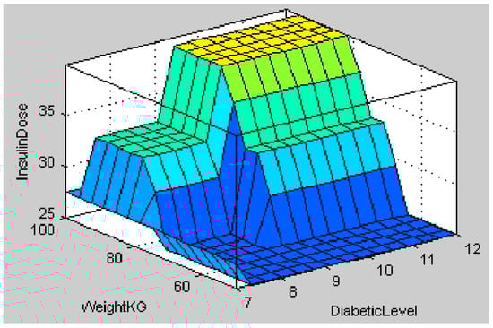 The fuzzy logic system for insulin calculation considers four inputs: the person’s health, diabetes level, weight, and carbohydrate intake. According to the input values in Figure 17, the health state is unhealthy (26.5), the diabetic level is medium (8.65 mmol/L), the weight is moderate (71.6 kg), and the carbohydrate intake is medium (260 g). According to the rules in Table 3, the centroid method of calculation indicates that the calculated insulin dosage is also in the medium range (27.5). Figure 18 depicts a 3 D view of all potential output insulin doses for various diabetic and carbohydrate intake amounts. Figure 19 depicts a surface view of the output dose based on the patient’s weight and diabetic status. Figure 18 and Figure 19 show that the calculated insulin dosage is in the high range if the diabetic level, body weight, and carbohydrate intake are all in the high or very high range. When these parameters fall within the low or moderate levels, insulin dosages also fall within these limits.